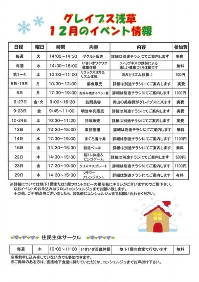毎月開催のフラワーアレジメントなどのイベントほか、お好み焼きイベント食やクリスマスプレートなど、寒い冬を楽しく乗り切るイベントを企画しています。