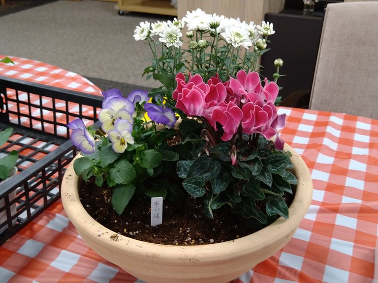 たくさんの季節の花の苗の中から、いくつか選んで大きな鉢に寄せ植えをしました。