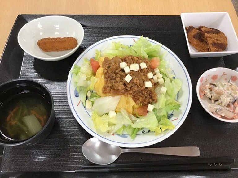 月に一度厨房さんの社名にちなんでマルタマデイがあります。この日は卵料理、主にオムライスに色々な変化をつけたメニューになっています。今月はタコライス風オムライスでした。