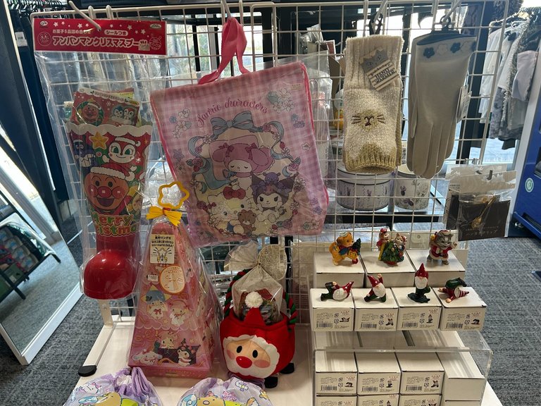 アンパンマンのクリスマスブーツやサンリオキャラクターのバッグ、あたたかい手袋、かわいいサンタさんや小人の置物など、見ているだけでも楽しいコーナーになっています✨