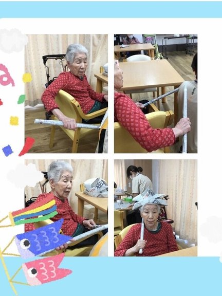 先日、レクリエーションで折り紙実施しました、早速作った兜を被って写真を一枚です(^^)