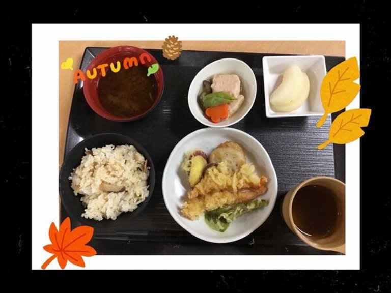 メニュー:松茸ご飯・天ぷら盛り合わせ・海老しんじょう煮物・赤出汁・梨