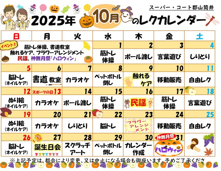 朝夕の心地よい風が秋の訪れを感じさせる季節となりました。10月もご入居者の皆様に、心身ともに楽しく活動していただけるよう、様々なレクリエーションを計画しております!