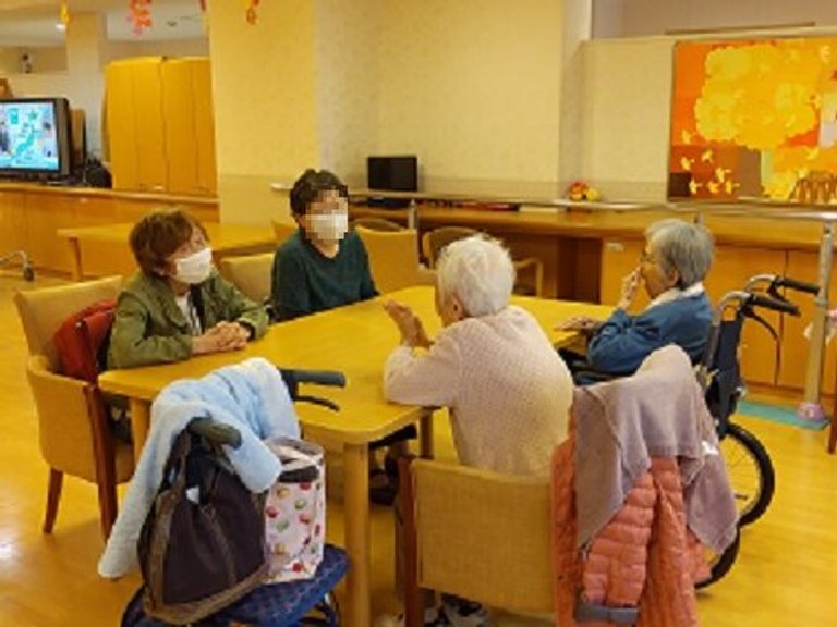 毎週火曜日にボランティアさんに来ていただき、お茶やコーヒー、おやつを食べながら楽しく会話をされています。今回は、趣味や習い事の話で盛り上がり、笑顔にあふれた1時間でした!