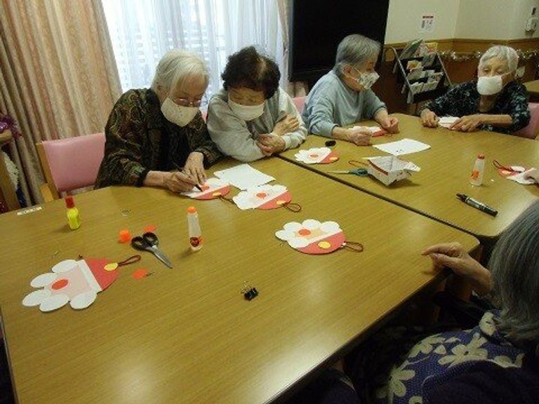 見本を見ていただき、折り紙を丸くカットしたパーツをお配りしたら「これどうするの?どのようにするの?」と…出来ていくうちに「可愛い~」とそれぞれに話され、喜んでいただけました。