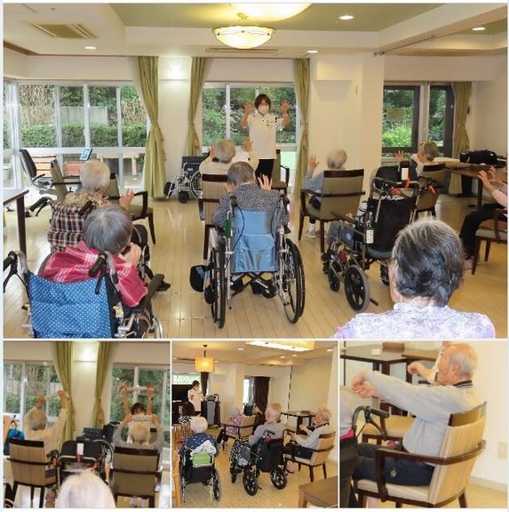 毎週実施されていますので、参加されているご入居者の皆様は慣れたご様子で、インストラクターのかたの動きに合わせてテンポよく反応されていたり、動きながら歌をうたわれたりされていました。