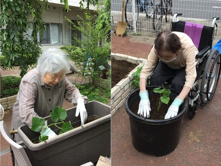 きゅうり・オクラ・ミニトマト・ゴーヤ・バジルをご入居者にお手伝いしていただき苗を植え無事完成。