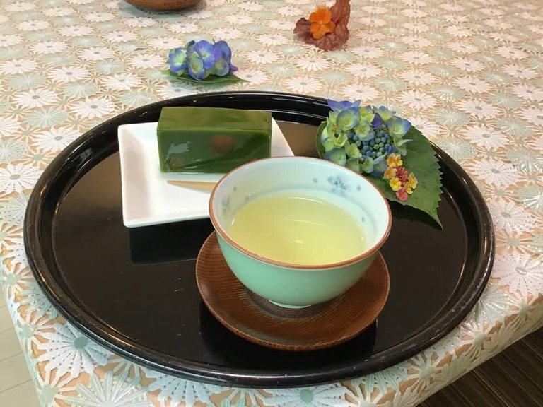 (夏の夕べの笹に集う野辺のほたる狩りに見立てた羊羹)