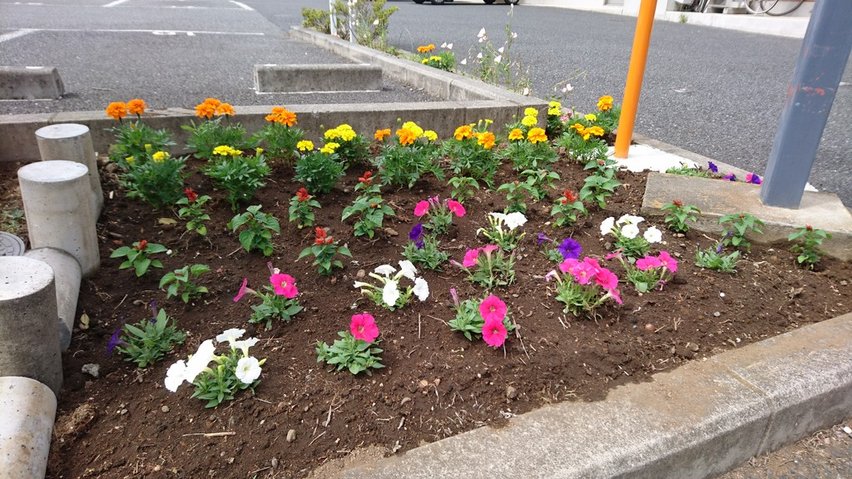 今年も職員だけでなくお住まいの方にも協力していただき、入口近くに小さな花壇を作りペテュニア・サルビア・マリーゴールドを植えました。