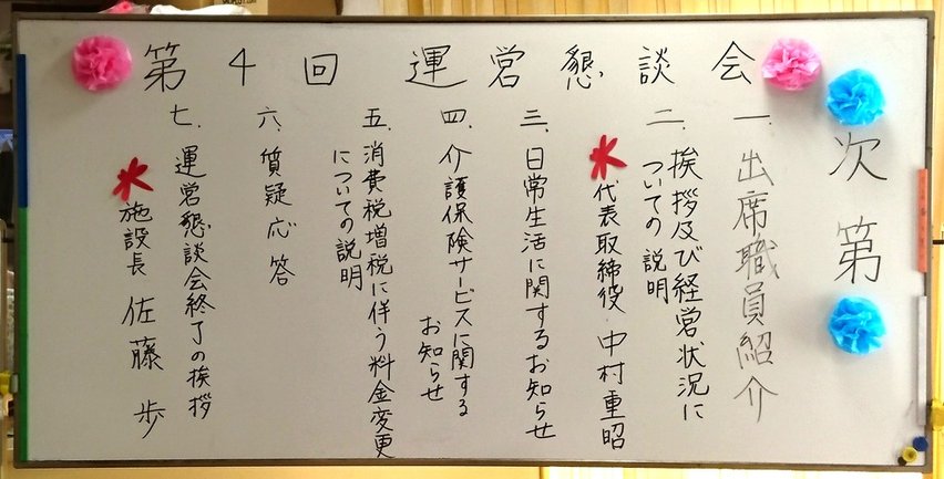 社長の挨拶では「皆さまのご協力で順調な運営で開設から12年を迎える事が出来た」事を伝え、説明事項では10月からの消費税増税に伴う料金変更や食費の軽減税率、契約内容変更に伴う手続きに関する事にほとんどの時間を使いご理解をいただきました。