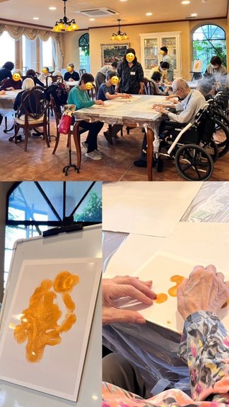 完成した作品はどれも個性が光り、お客様同士で「こんな色ができたよ」「面白い表現だね」と、会話も弾んでいらっしゃいました😊 認知症予防にも繋がるこのプログラムは、心と脳を活性化するとともに、新しい自分を発見する喜びにも満ちています。