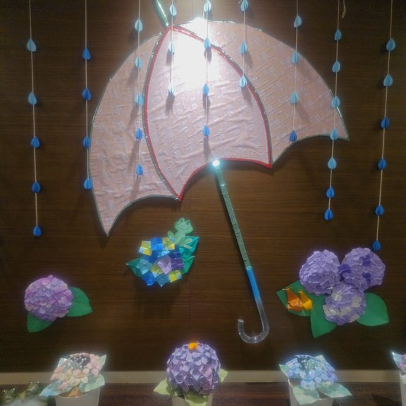 雨の季節となりました。鬱陶しい時期ですが、ご入居者がイベントホールへ向かう廊下に大きな素敵な傘と紫陽花展示されました。気分を明るくしてくれます。よ~く見るとカエルやカタツムリが楽しそうにしております。皆さんは何処にいるかわかりますか??🐸🐌