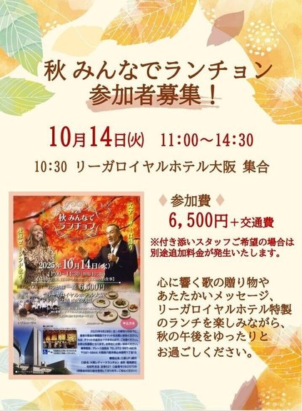 秋のひととき、心に響く歌とあたたかいメッセージに耳を傾けながら、 リーガロイヤルホテル特製ランチをゆっくりと楽しみませんか?