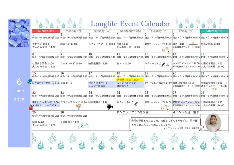 ロングライフうつぼ公園では、心豊かな時間をお届けするため、今月もさまざまなイベントをご用意しております。