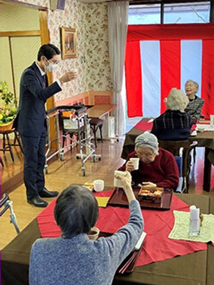 職員からご入居者の皆様へ新年の挨拶をさせていただき乾杯🥂