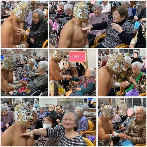 ご入居者お一人お一人と握手やチョップ、鍛え上げられた胸筋に触れたりと...