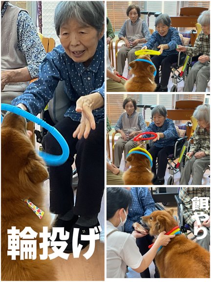 入居者様が輪っかを投げてわんちゃんの首にかけます。