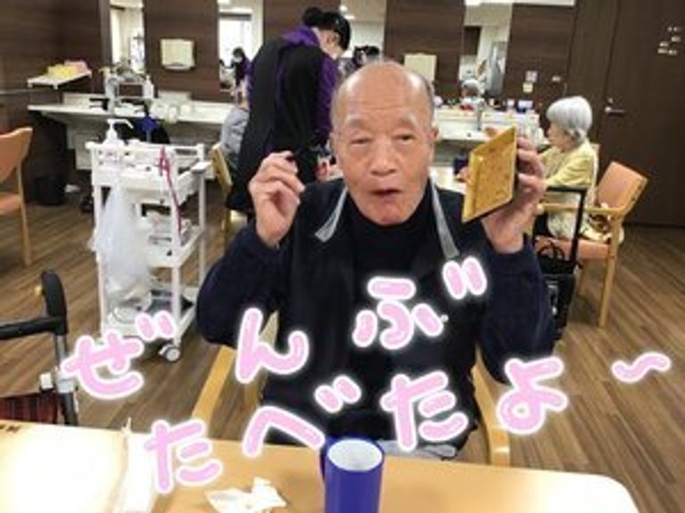 美味しいおはぎやプリンを召し上がりながら同じテーブルのご入居者と談笑し