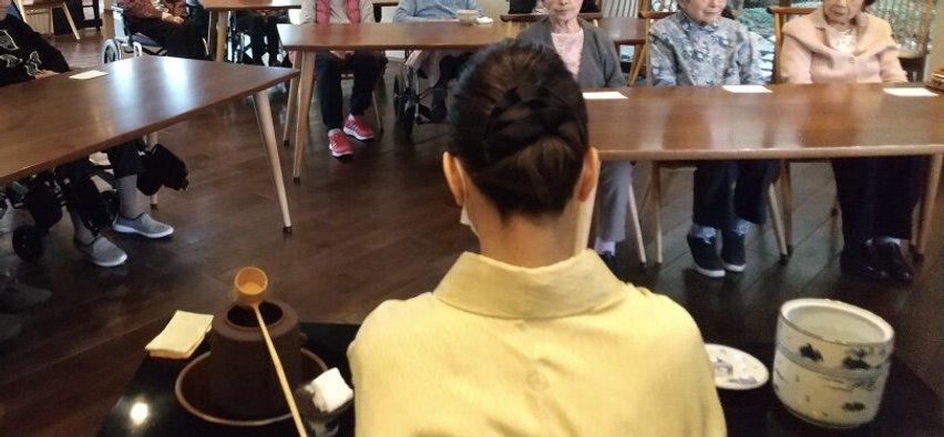 女性陣は格子戸近くでお喋りを楽しみつつ、老舗・老松の生菓子『陽春』を味わわれました😊