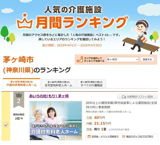 茅ケ崎市の介護付有料老人ホーム人気ランキング2位に選出されました(LIFULL介護2025年4月)