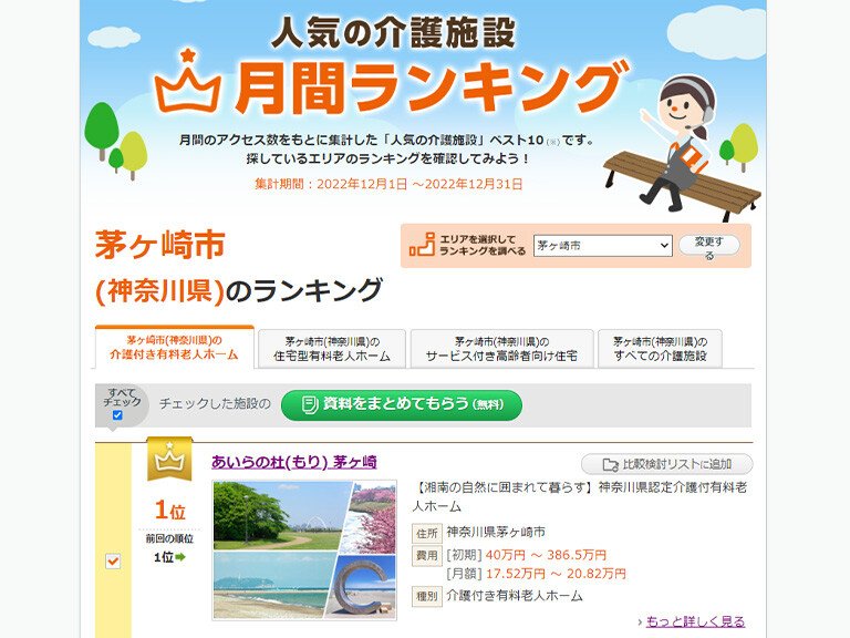 今月も茅ヶ崎市介護付有料老人ホーム人気ランキングで1位に選出されました(LIFULL介護2023年1月)