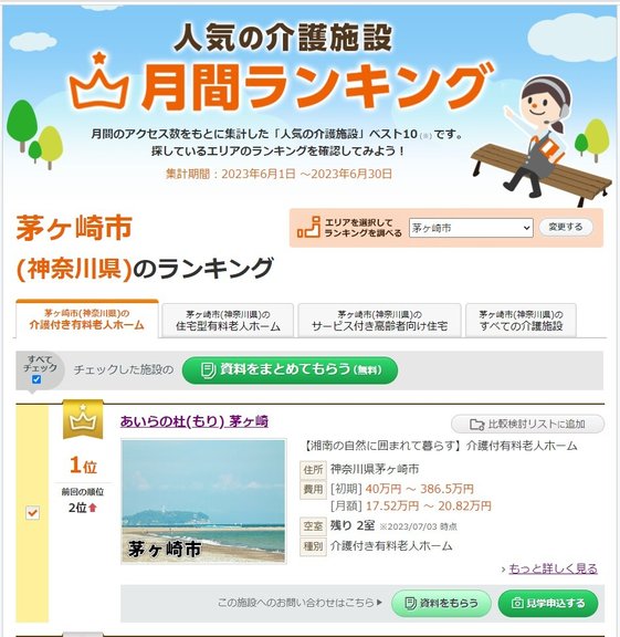茅ヶ崎市の介護付有料老人ホーム人気ランキングで1位に選出されました(LIFULL介護2023年7月)