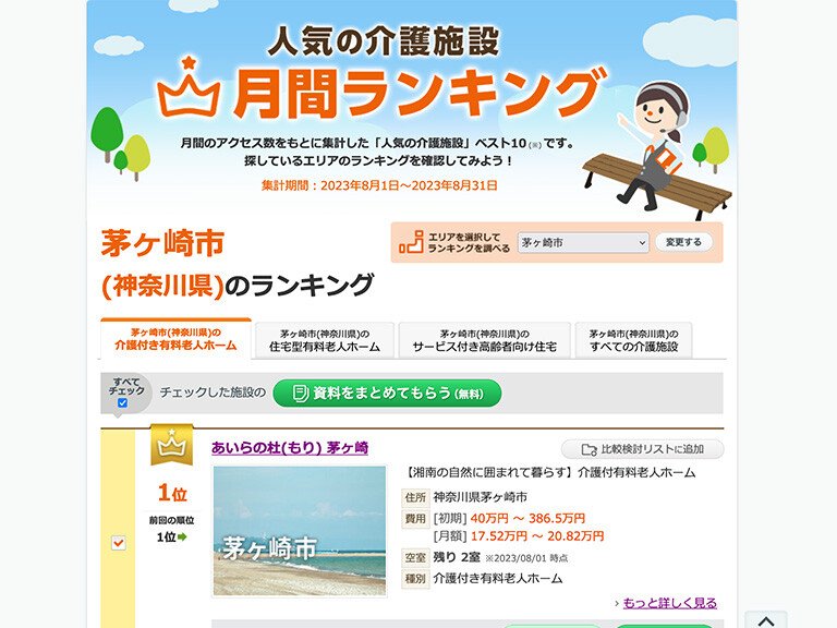 茅ヶ崎市の介護付有料老人ホーム人気ランキングで9ヶ月連続1位に選出されました(LIFULL介護2023年1-9月)