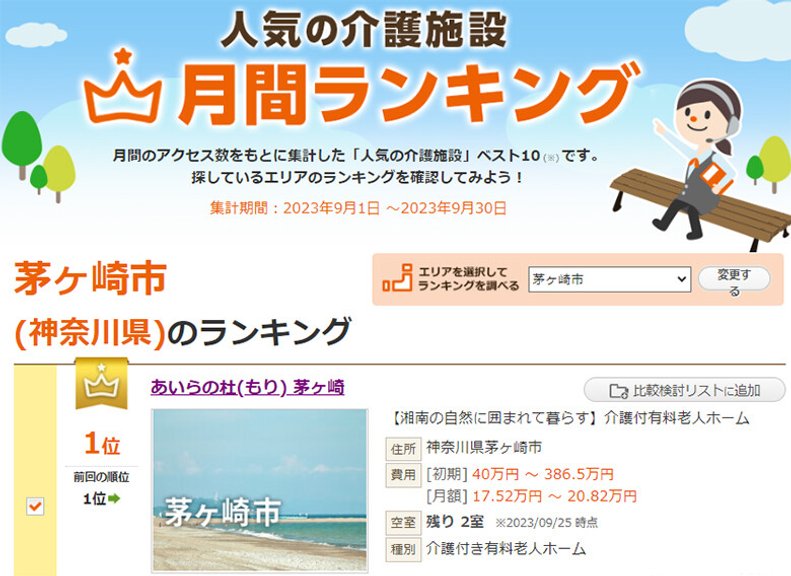 茅ヶ崎市の介護付有料老人ホーム人気ランキングで10ヶ月連続1位に選出されました(LIFULL介護2023年1-10月)