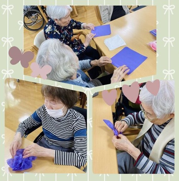 今回は、食堂壁に飾り付ける 「紫陽花」 をお花紙で作りました❀