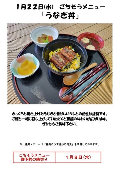 1月のごちそうメニューは『 うなぎ丼 』です。
