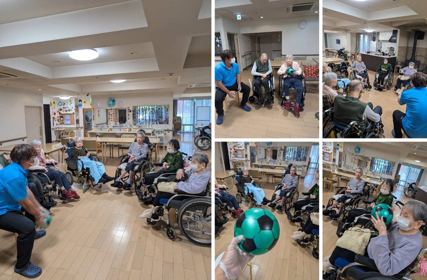 投げられたボールを受け取ったり、投げたり、叩いたり、蹴ってみたりと、身体を動かしていただきました。