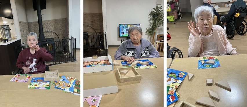 職員と一緒に考えながら頭を使い、声に出してパズルが完成すると、手を叩いて笑いながら楽しい時間を過ごせました。