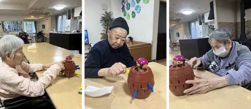 一つ一つ剣を刺しながらいつ飛び出すのかドキドキしていました。黒ひげが飛び出すとびっくりされた様子で楽しい時間を過ごすことが出来ました。