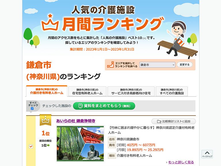 今月も鎌倉市介護付有料老人ホーム人気ランキングで1位に選出されました(LIFULL介護2023年2月)