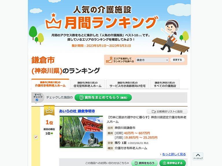 今月も鎌倉市介護付有料老人ホーム人気ランキングで1位に選出されました。