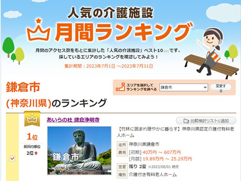 今月も鎌倉市介護付有料老人ホーム人気ランキングで1位に選出されました。
