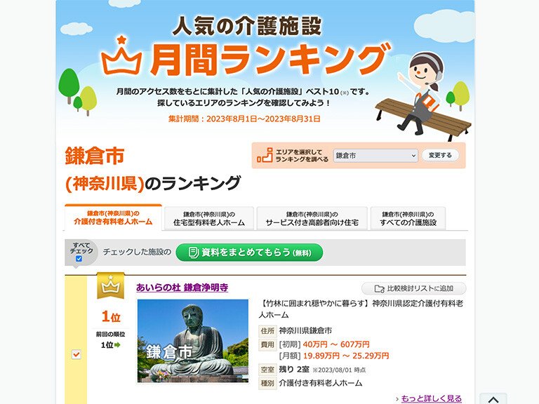 鎌倉市介護付有料老人ホーム人気ランキングで、10ヶ月1位に選出されました。