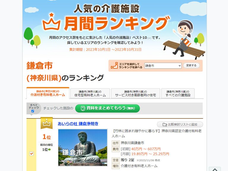 鎌倉市介護付有料老人ホーム人気ランキングで、12ヶ月1位に選出されました。