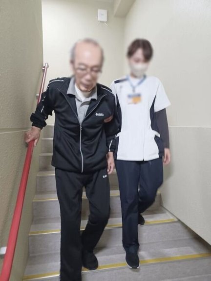 今回は、理学療法士の先生と個別リハビリとして、リハビリ室を離れて「階段の昇降訓練」に取組んでおられました。