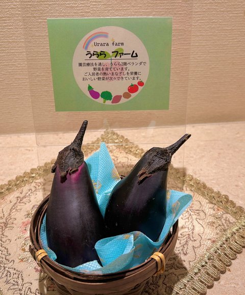「ナスは焼いて食べたいわね」「花が咲いているからまだまだできるわね」と楽しみにしながらご入居者と外を眺めています。