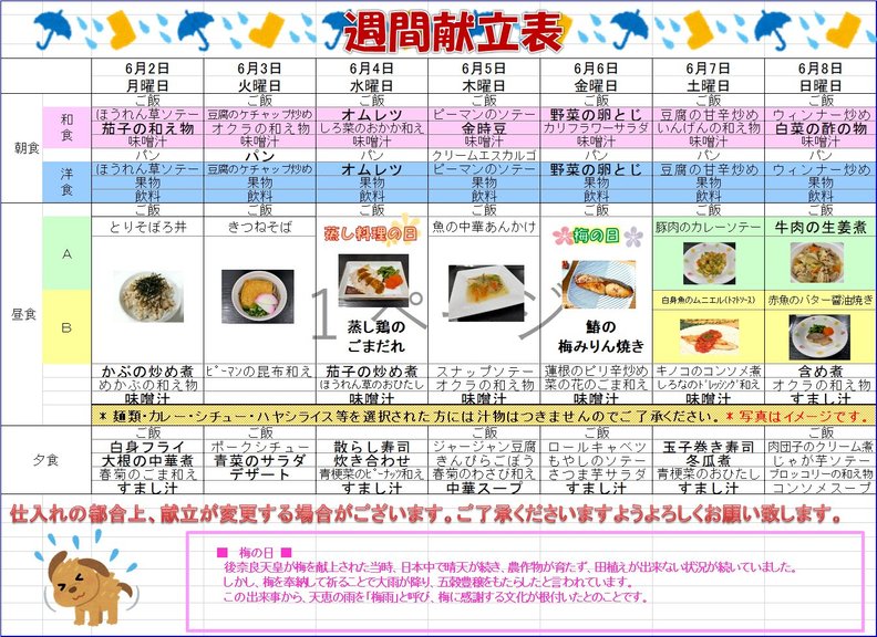 ☆来週の食事メニュー☆