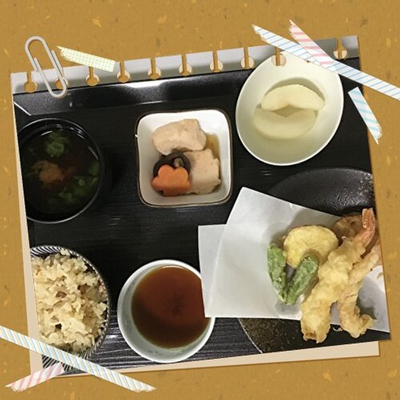 献立は松茸ごはん、てんぷら盛り合わせ、海老しんじょうの煮物