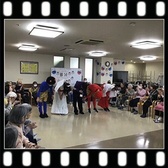 今回の節分レクリエーションでは、職員が青鬼、赤鬼と変装し節分ならではの豆まきを行っていただきました。