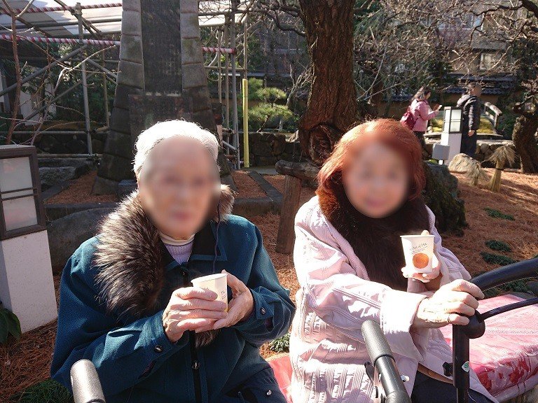 初詣レクでお参りをした後は、温かい甘酒でほっと一息。
