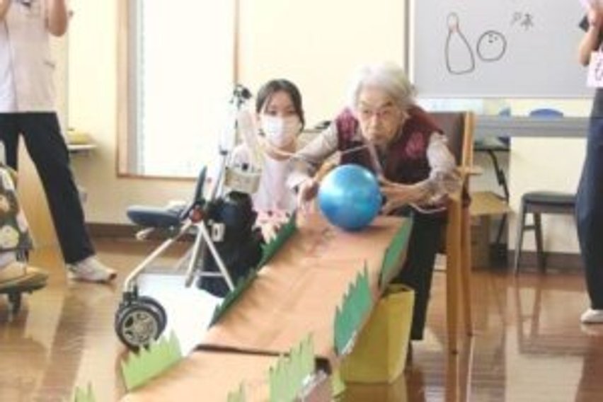 「どうすれば多くのお客さまに楽しんでいただけるか」をグループで話し合い、オリジナルのボウリングゲームを考案しました。スロープ状のレーンのスタート地点には桜の木の根元がデザインされており、ボールが転がるとともに、命中したピンク色のペットボトルが花びらのように倒れていくという仕掛け。まるで桜が満開になるかのような演出に、歓声が上がります。