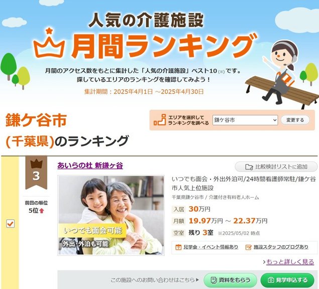 鎌ヶ谷市の介護付有料老人ホーム人気ランキング3位に選出されました(LIFULL介護2025年4月)