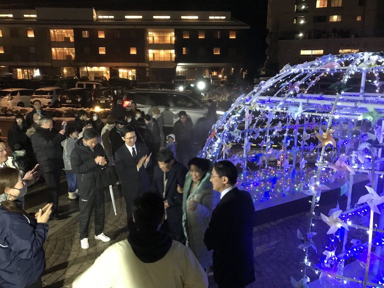 その中で、期間限定でテラス前にクリアファイルで風車をつくり、それをドームテントにした物を並べ、夜間にライトアップ(イルミネーション)されました。 点灯式には平井鳥取県知事も来場されました。