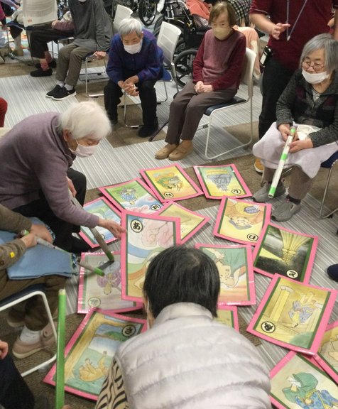 だるまころがしやお年玉入れ、かるたなどのゲームを行い、利用者から楽しかったと感想をいただきました。