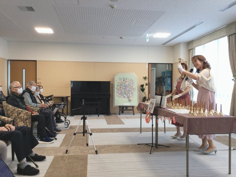 結いホーム宝塚ではアフタヌーンコンサートを開催しました。宝塚アーティスト協会から~SWEET BELL~さんをお招きし、ハンドベルの演奏会を開催しました。まずは『アヴェ・マリア』の美しい旋律が響き、心が静かに穏やかになりました。その後、『ふるさと』をハンドベルの演奏と共に合唱し、『花』をハンドベルで演奏、ハンドベルと合唱が響き渡りました。『ゆき』の曲を通して、雪の静けさが音楽に乗って広がり、施設内に温かな空気が漂いました。『見上げてごらん夜の星を』では、皆で星空を想いながら歌い、心がひとつにまとまりました。その後はハンドベルで救急車のサイレン音や昔懐かしい正露丸のCMソングをハンドベルで演奏して当てていくという脳トレも挟みながら、最後は津軽海峡冬景色、瀬戸の花嫁を披露して頂き、馴染みの曲を懐かしみ、参加者の皆さんも楽しまれていました。