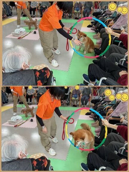 ご入居者様にフラフープを持っていただき、